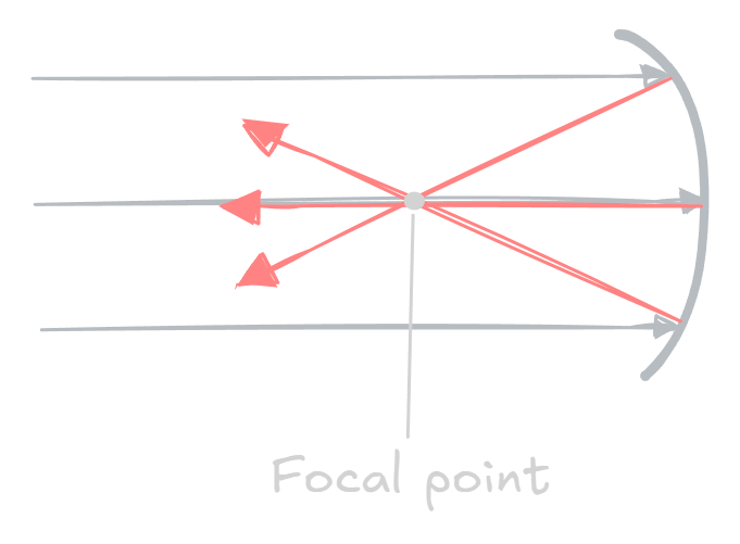 A concave mirror is a mirror that is curved inwards. It is called a converging mirror because it causes all the light rays to meet at a single point — the focal point.