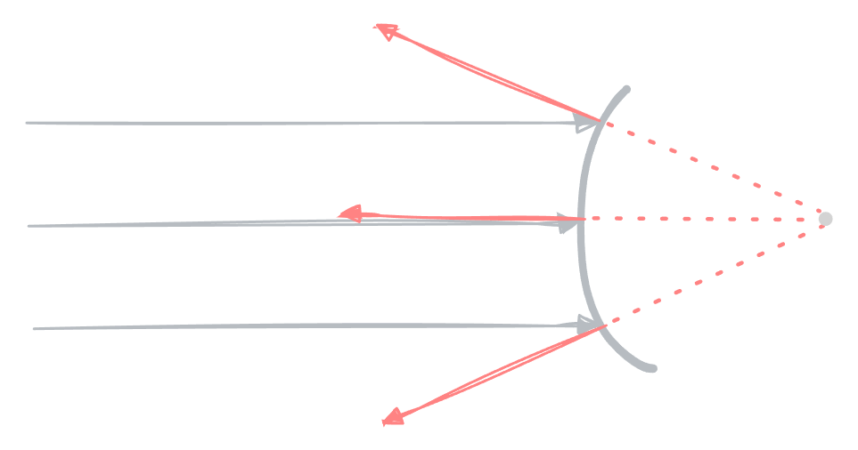 The light rays appear to be coming out from a point behind the mirror — an imaginary focal point.