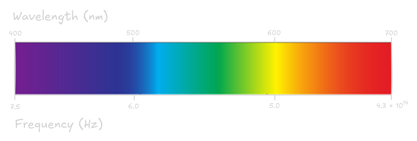 Each colour of light has a different wavelength and frequency. The wavelengths of visible light are extremely small, ranging from violet light (wavelengths of around 400nm), through to red light (around 700nm).